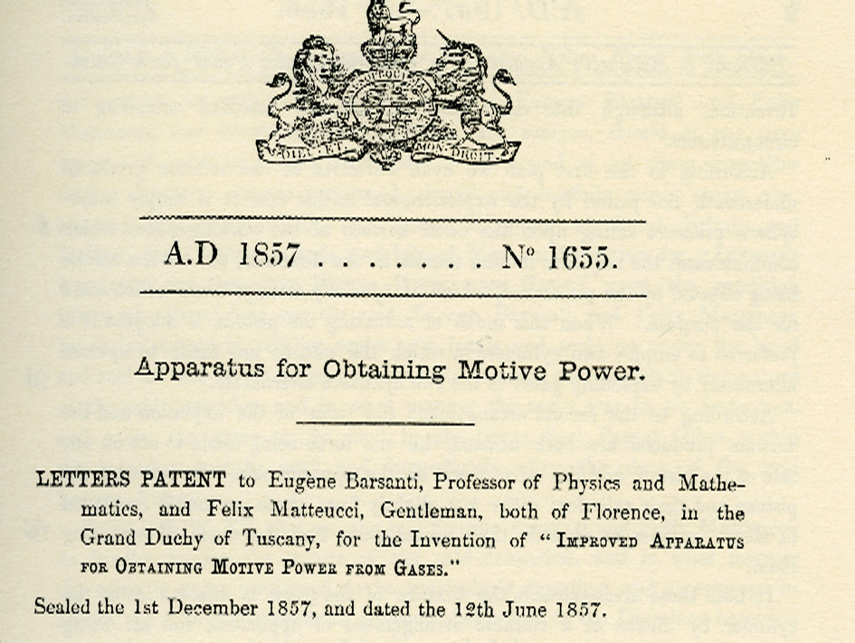 Il 12 dicembre 1857 il Great Seal Patent Office concede il brevetto n°1655 a Barsanti e Matteucci per l’invenzione di un Improved Apparatus For Obtaining Motive Power From Gases.
