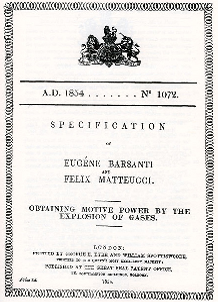 16 luglio 1862Brevetto Belga n. 12922Nuovi sistemi perfezionati per ottenere forza motrice per mezzo della detonazione di un miscuglio d’aria atmosferica e di un gas infiammabile inventati dai signori Eugenio Barsanti, Felice Matteucci e Giovan Battista Babacci.