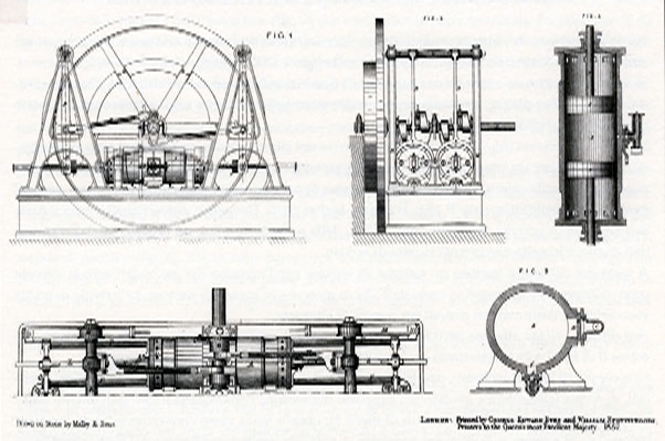 “ … when applying this Invention to a locomotive engine, as it is intended to supply the place of two double action (or high-pressure) cylinders, four cylinders must be employed, one on each of two pairs of driving wheels, the main shafts being made to drive these wheels by means of connecting rods or gearing combined in such a manner as to change the direction of rotation by means of clutches.”