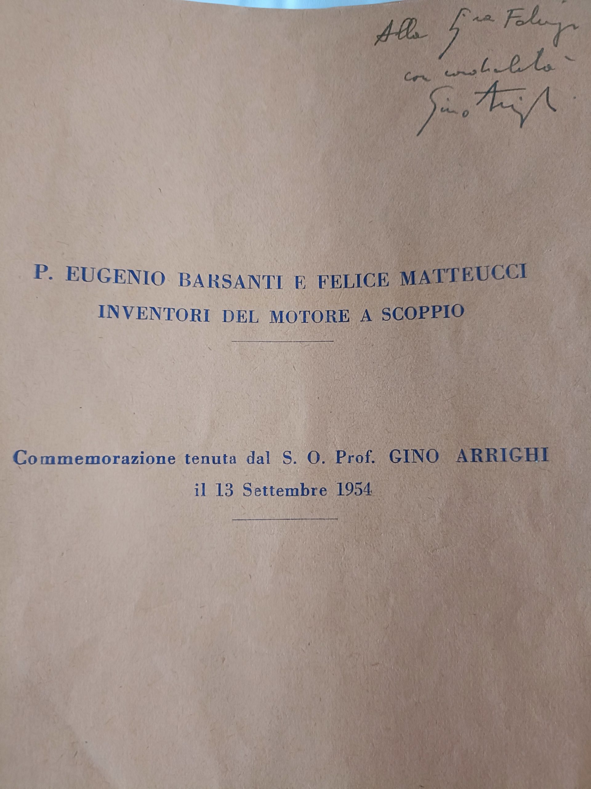 Si tratta del discorso di commemorazione dei 100 anni del motore a scoppio, pronunciato dal prof. Gino Arrighi all’Accademia Lucchese di Scienze, Lettere ed Arti il 13 settembre 1954. Un libretto che porta con sé anche una dedica personale: il prof. Arrighi lo aveva regalato alla prof.ssa Fabrizi, zia dell’ing. Ciancaglini, che lo ha oggi affidato a noi.
